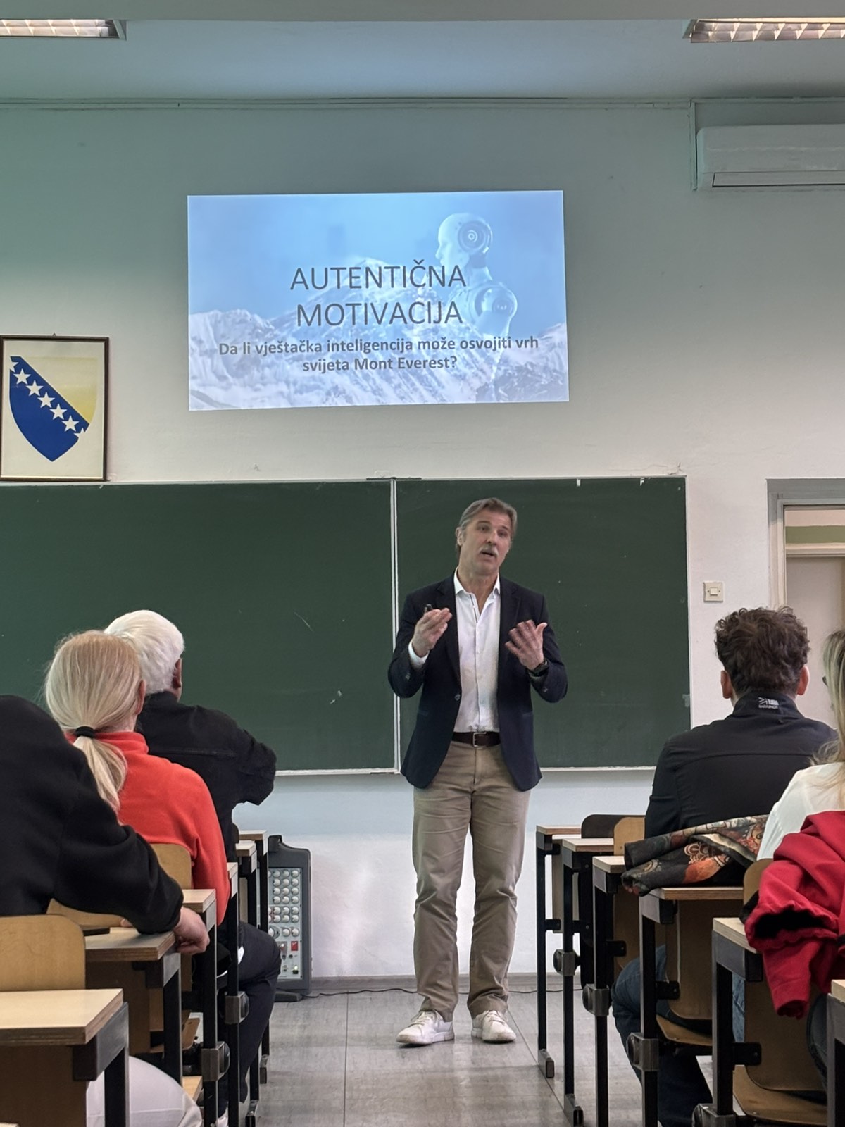 U okviru manifestacije STUFEK 2026 na Filozofskom fakultetu Univerziteta u Zenici u četvrtak, 09. 04., održano je izuzetno inspirativno predavanje Tomislava Cvitanušića pod nazivom „Autentična motivacija: Da li vještačka inteligencija može osvojiti vrh svijeta – Mont Everest?“.