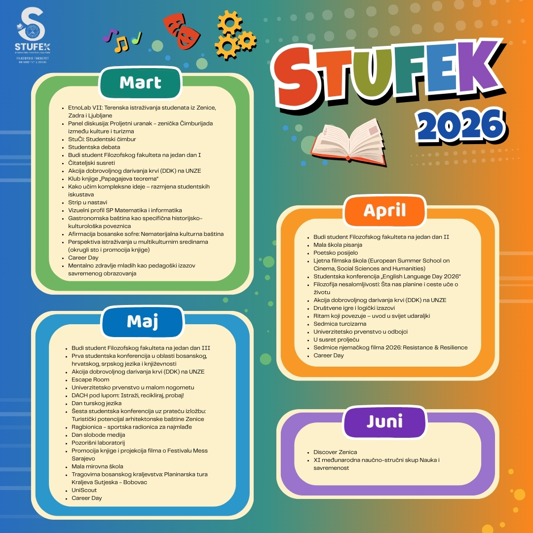U okviru studentskog festivala STUFEK na Filozofskom fakultetu Univerziteta u Zenici, održana je panel diskusija pod nazivom „Proljetni uranak – Zenička čimburijada: između kulture i turizma”, kao rezultat kontinuirane saradnje…